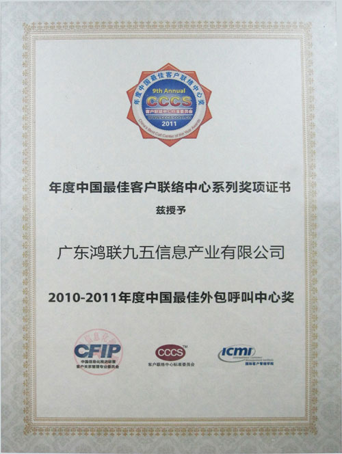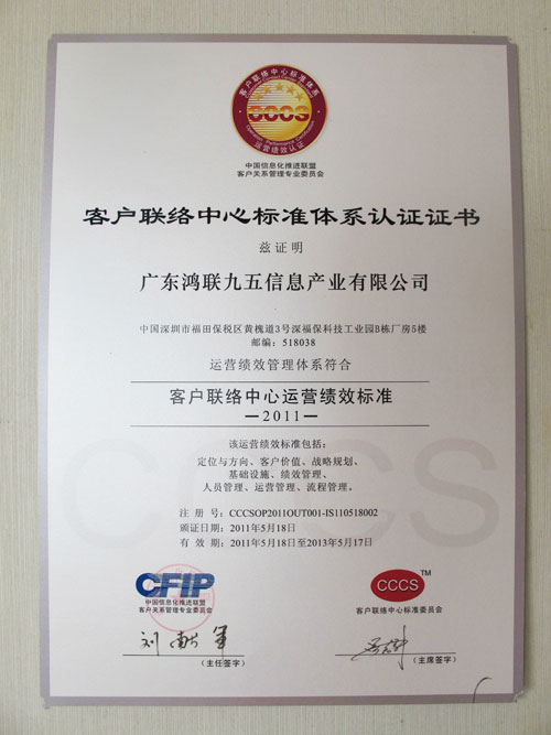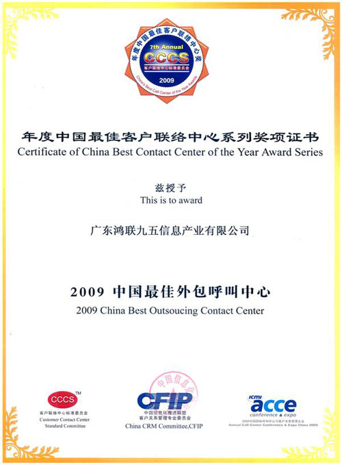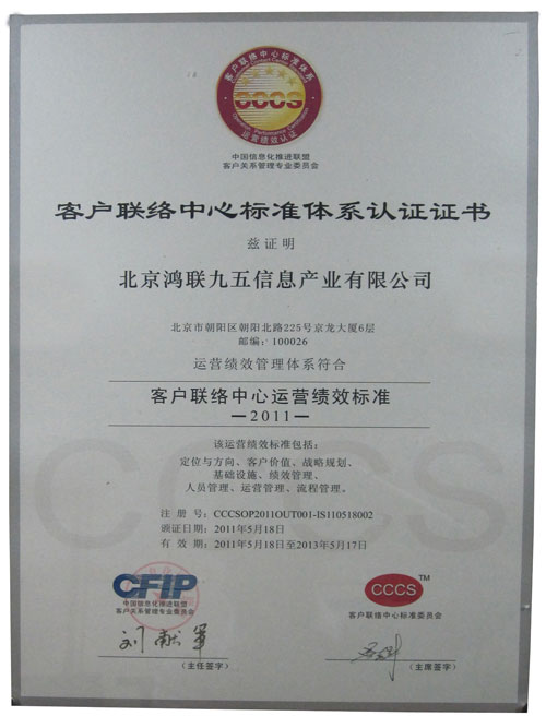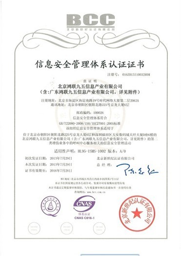 鴻聯(lián)九五經(jīng)歷多年的運(yùn)營(yíng)管理優(yōu)化,不斷的通過(guò)各類(lèi)體系和權(quán)威的認(rèn)證,如 ISO27001 安全管理體系認(rèn)證、ISO9001 質(zhì)量管理體系認(rèn)證、ISO14001 環(huán)境管理體系認(rèn)證、ISO22301業(yè)務(wù)連續(xù)性管理體系認(rèn)證、ISO27701 隱私信息管理體系認(rèn)證和 OHSAS18001職業(yè)健康安全管理體系認(rèn)證等。目前已獲得行業(yè)的認(rèn)可和肯定,成為通信行業(yè)、呼叫協(xié)會(huì)、人力資源行業(yè)的理事單位。連續(xù)多年榮獲中國(guó)最佳外包服務(wù)商獎(jiǎng),2017年榮獲北京市海淀區(qū)中關(guān)村質(zhì)量獎(jiǎng),除此之外,鴻聯(lián)九五還廣泛受到客戶(hù)的認(rèn)可與肯定,收到多家合作伙伴的表?yè)P(yáng)信、優(yōu)秀供應(yīng)商獎(jiǎng)等。