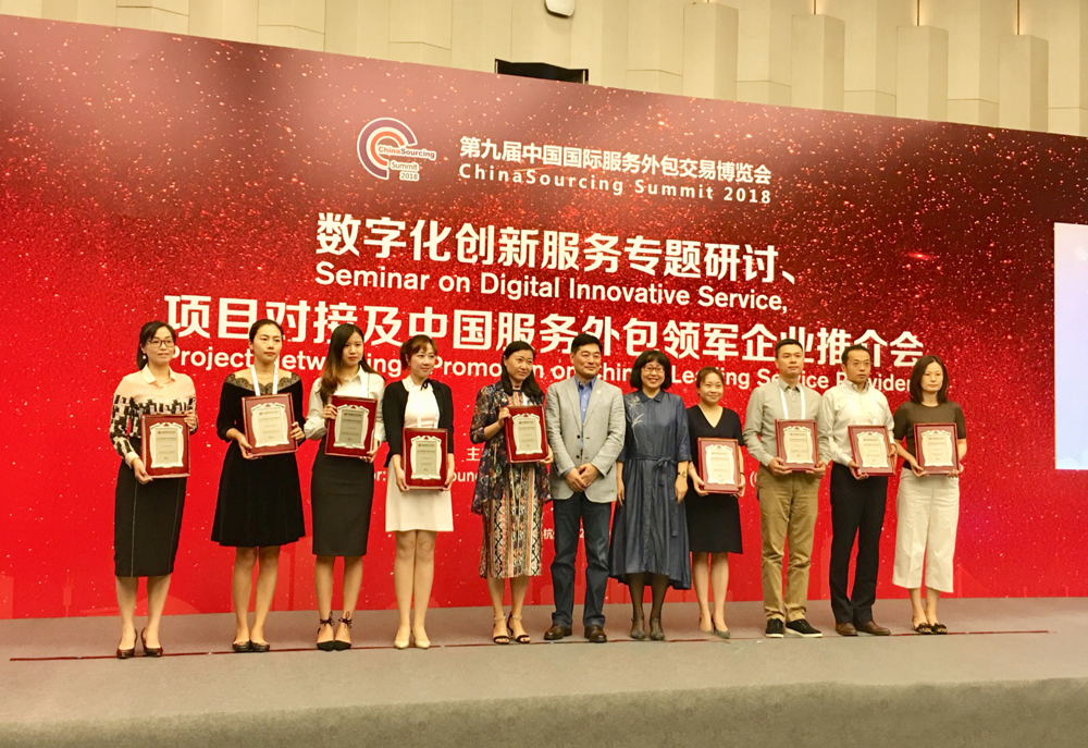 9月26日,大會首先舉行了“2018數(shù)字化創(chuàng)新服務(wù)專題研討、項(xiàng)目對接及中國服務(wù)外包領(lǐng)軍企業(yè)推介會”,中國國際投資促進(jìn)會會長、商務(wù)部原副部長馬秀紅等領(lǐng)導(dǎo)出席,F(xiàn)場舉行頒獎(jiǎng)儀式,對2018年在服務(wù)外包領(lǐng)域表現(xiàn)優(yōu)異的企業(yè)進(jìn)行頒獎(jiǎng),鴻聯(lián)九五榮獲“2018年度中國服務(wù)外包金融行業(yè)領(lǐng)軍企業(yè)”以及“中國服務(wù)外包百強(qiáng)企業(yè)”等兩項(xiàng)大獎(jiǎng),張雅總代表公司領(lǐng)獎(jiǎng)。