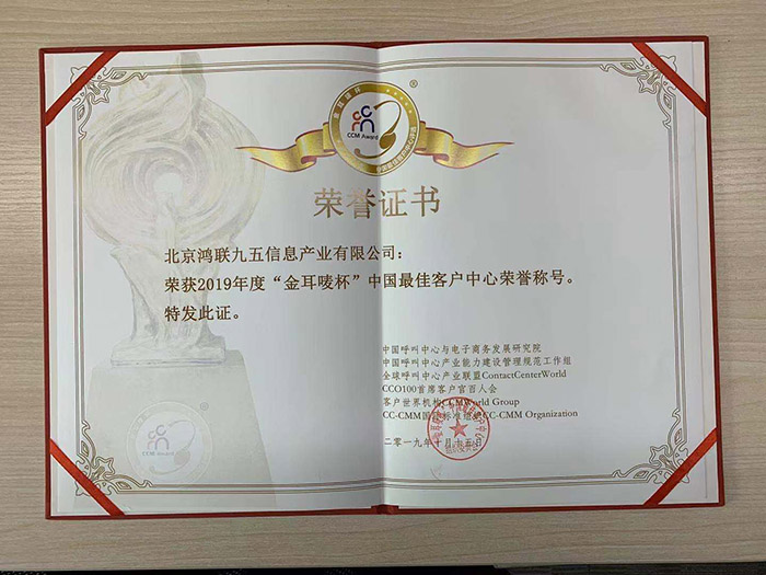 通過評(píng)審團(tuán)嚴(yán)格的評(píng)選流程,北京鴻聯(lián)九五信息產(chǎn)業(yè)有限公司榮獲2019年度“金耳嘜杯”中國(guó)最佳客戶中心榮譽(yù)稱號(hào),鴻聯(lián)九五呼叫中心事業(yè)部總經(jīng)理趙蕊女士榮獲“最佳管理人獎(jiǎng)”。